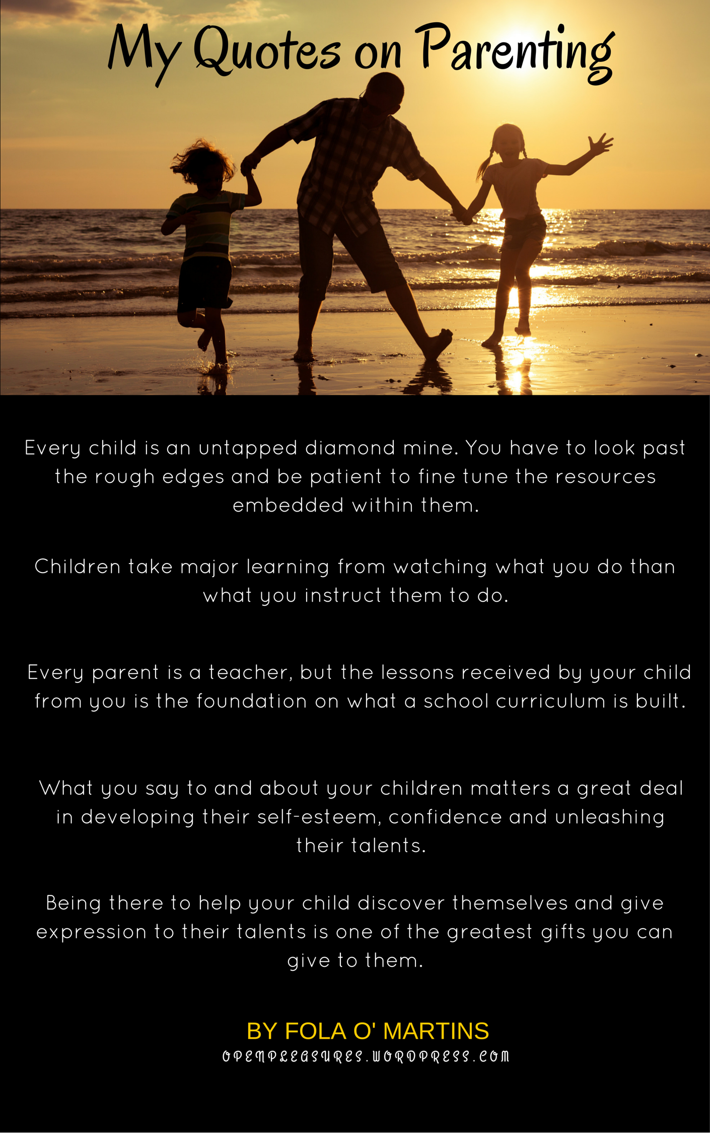 My Quotes on Parenting Image | October 26, 2015August 4, 2016 | Fola O' Martins Share this: Click to share on Facebook (Opens in new window) Facebook Click to share on X (Opens in new window) X Click to share on WhatsApp (Opens in new window) WhatsApp Click to email a link to a friend (Opens in new window) Email More Click to share on Pinterest (Opens in new window) Pinterest Click to print (Opens in new window) Print Click to share on LinkedIn (Opens in new window) LinkedIn Like Loading... Related