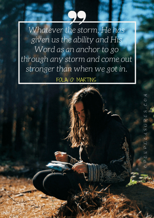 Sometimes, we go through storms and it may appear that God has left us or cannot save us. It may look like we would not come out of the situation we’re in but God never promised that we won’t witness storms. What He promised is that He will never leave us nor forsake us. Whatever the storm, He has given us the ability and His Word as an anchor to go through any storm and come out stronger than when we got in.  It may seem that He’s not being on time, remember He is not running on our own time but His time. Stay strong and praise God in that storm.
